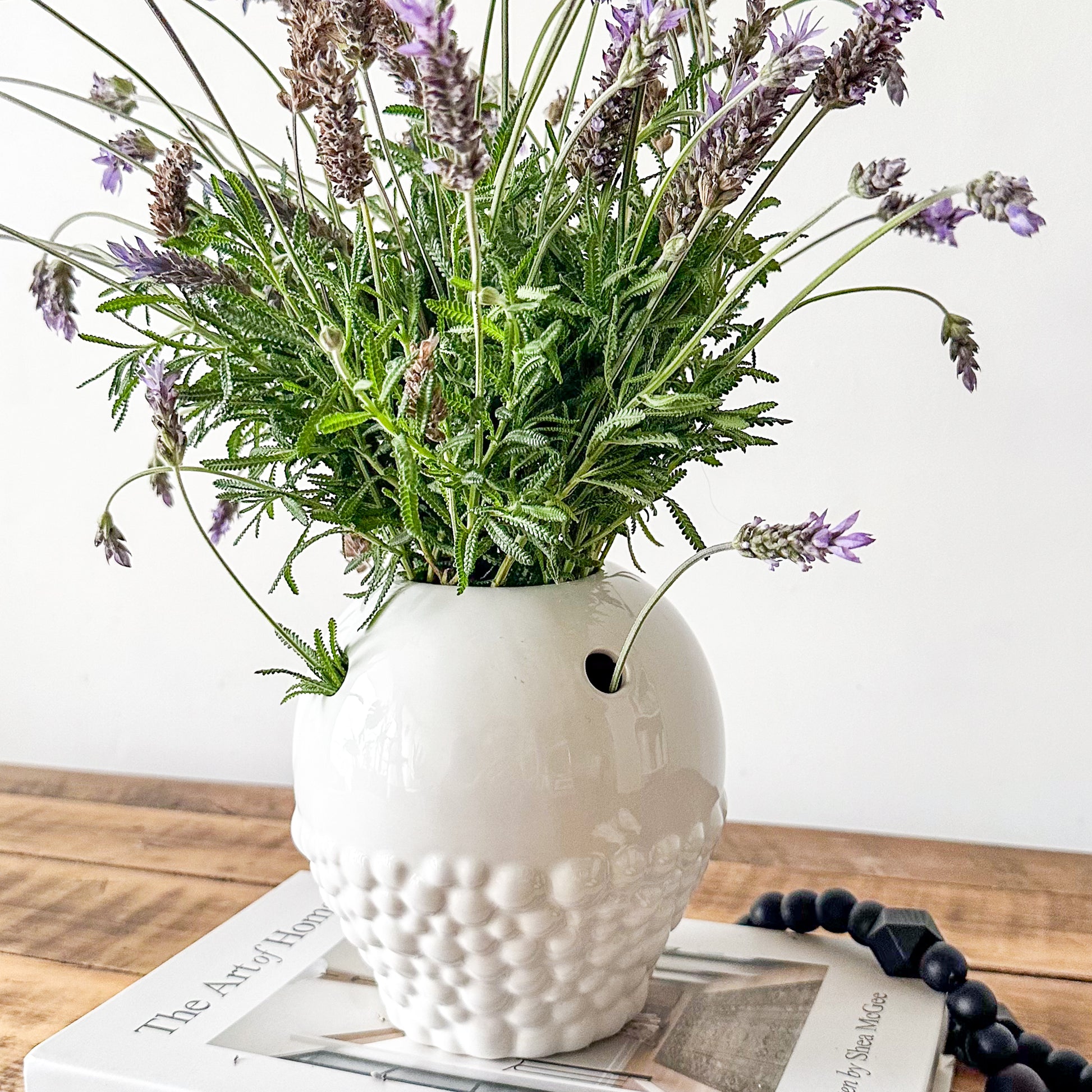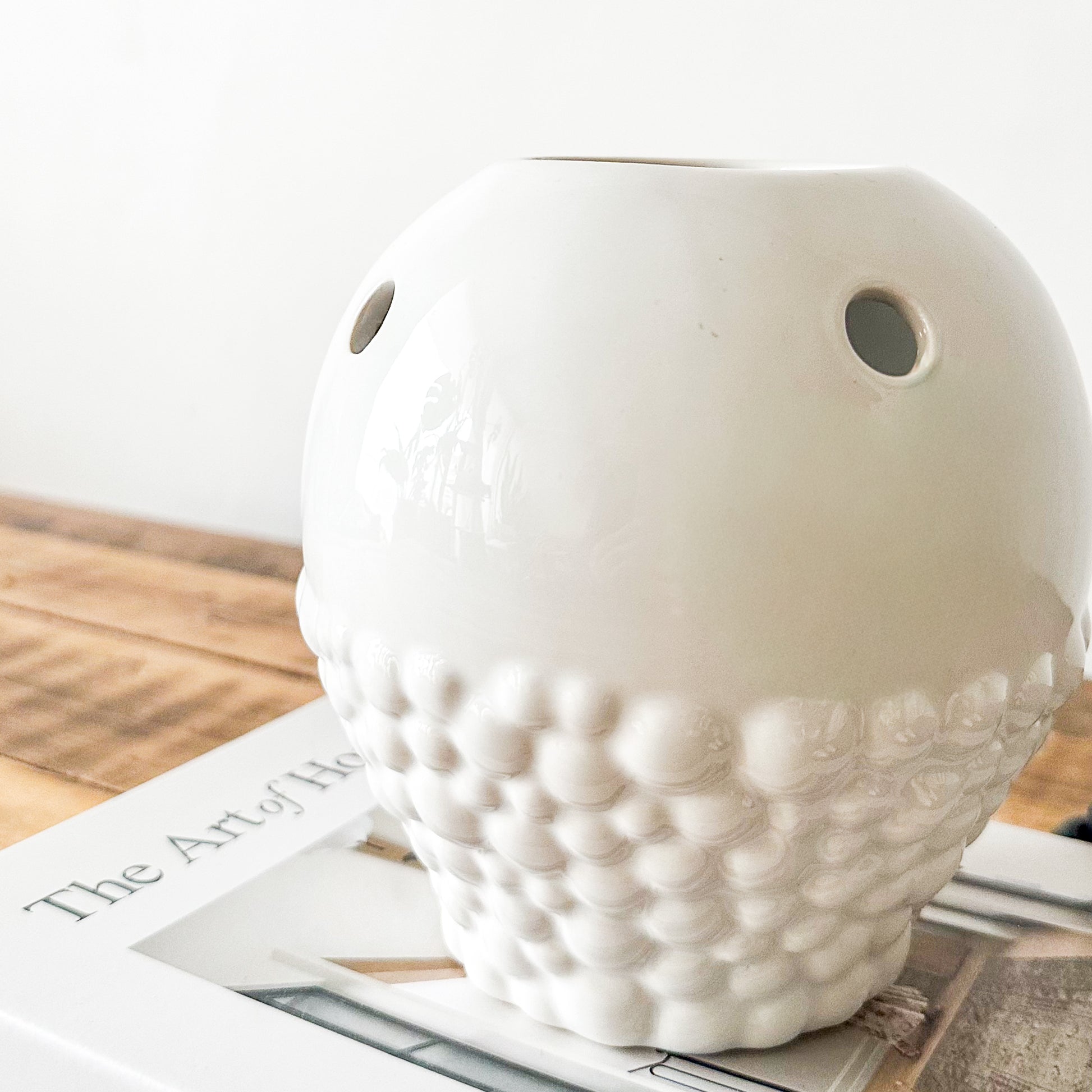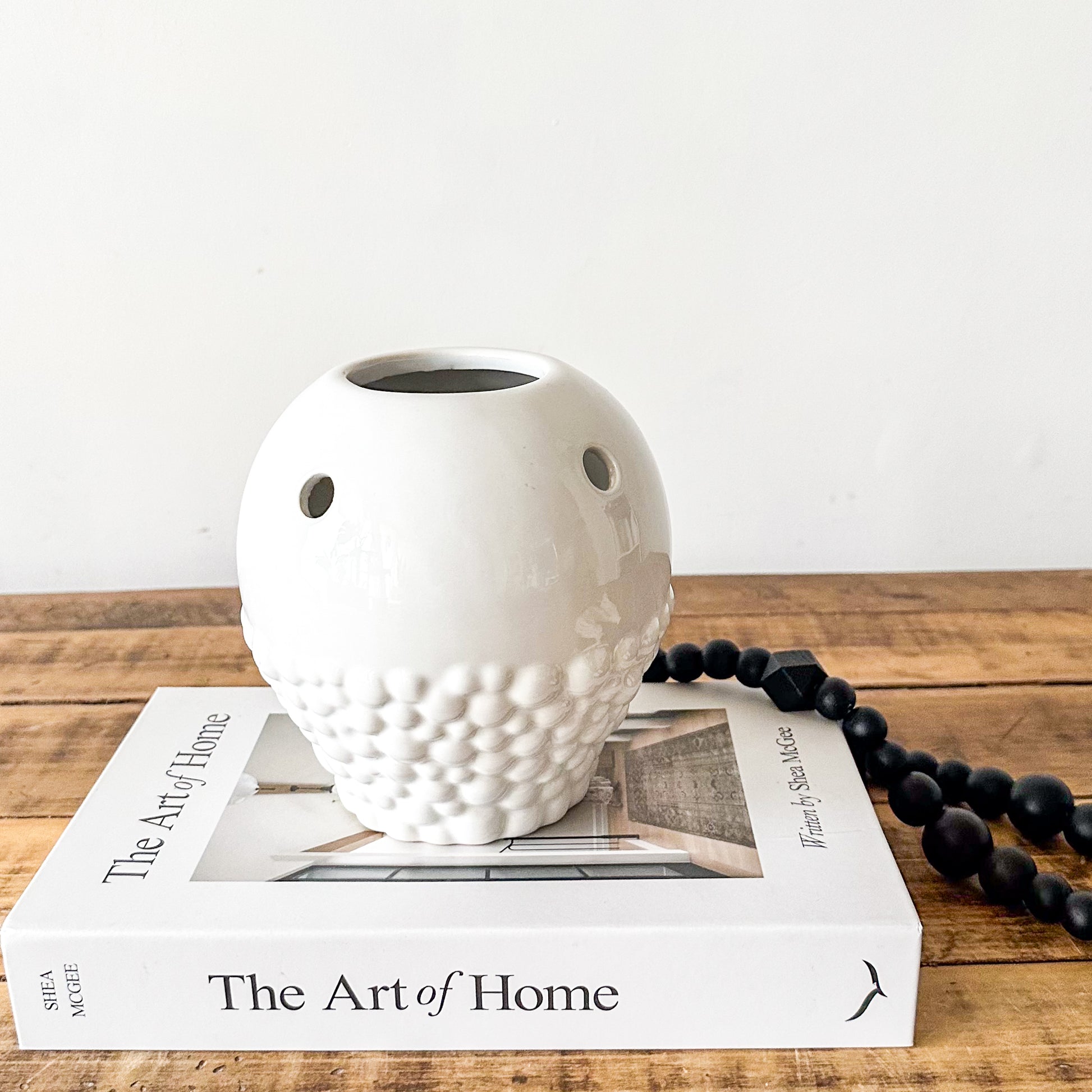 Este florero de cerámica redondo, con 15 cm de alto, 14 cm de ancho en la boca y una base de 8,5 cm, destaca por sus delicadas perforaciones laterales de 1,5 cm. Diseñado para crear arreglos florales modernos y a la vanguardia, aporta un toque sofisticado y contemporáneo a cualquier ambiente. Ideal para quienes buscan elegancia y estilo en su decoración.