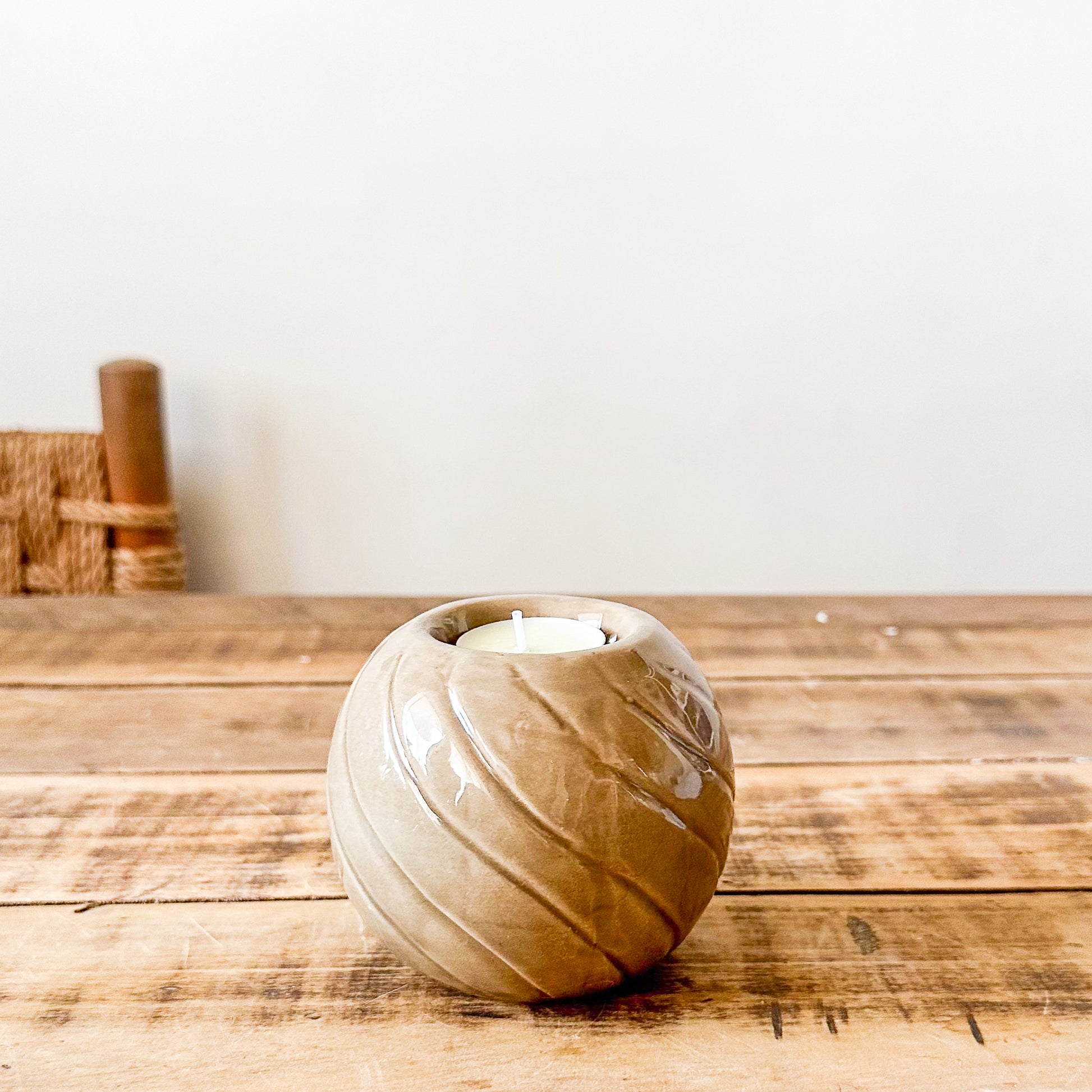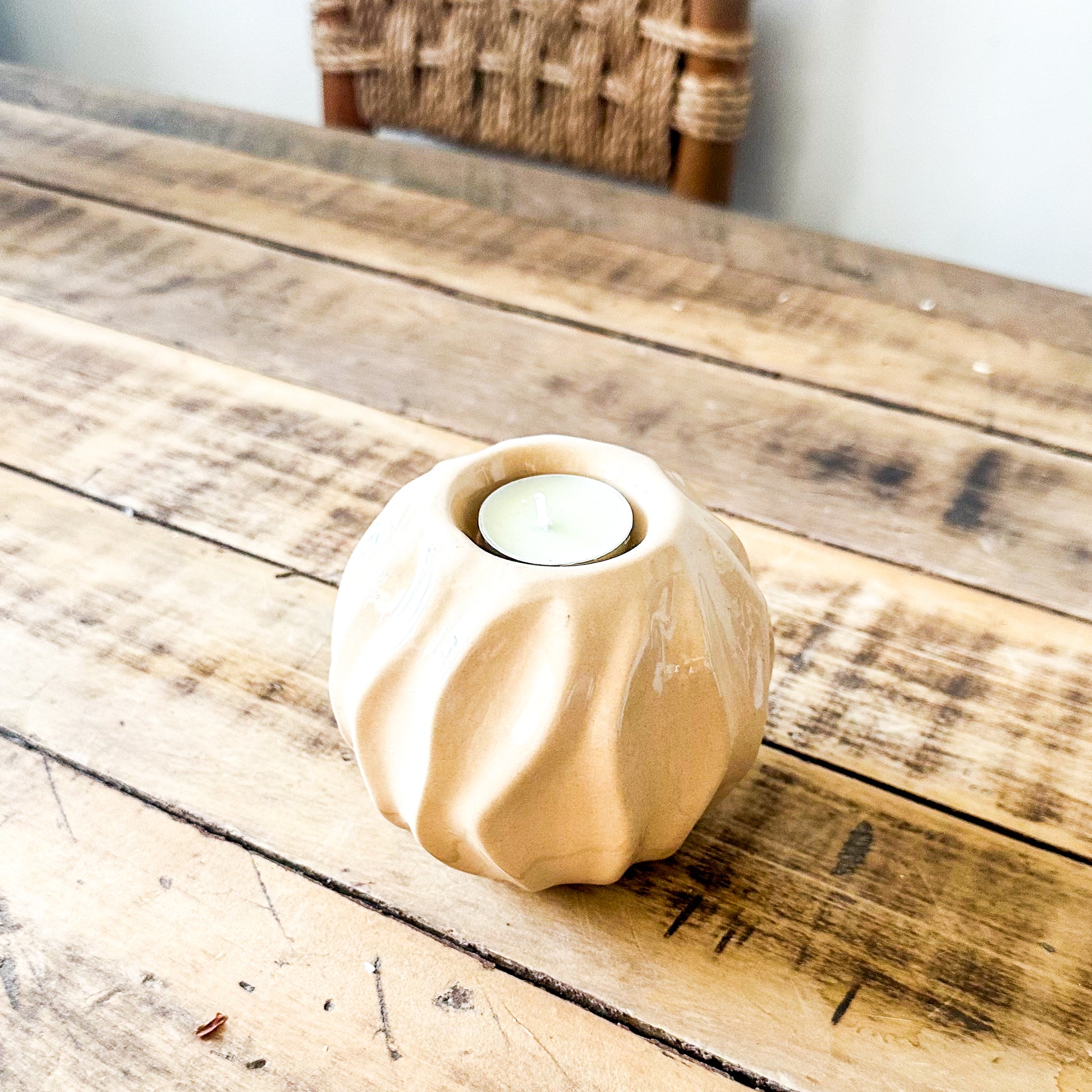 Descubre la belleza artesanal de estos portavelas de cerámica esmaltada, cada uno con relieves únicos que combinan ondas y texturas delicadas. Disponibles en cuatro diseños exclusivos, estas piezas transforman la luz de las velas en una experiencia visual y táctil cautivadora.