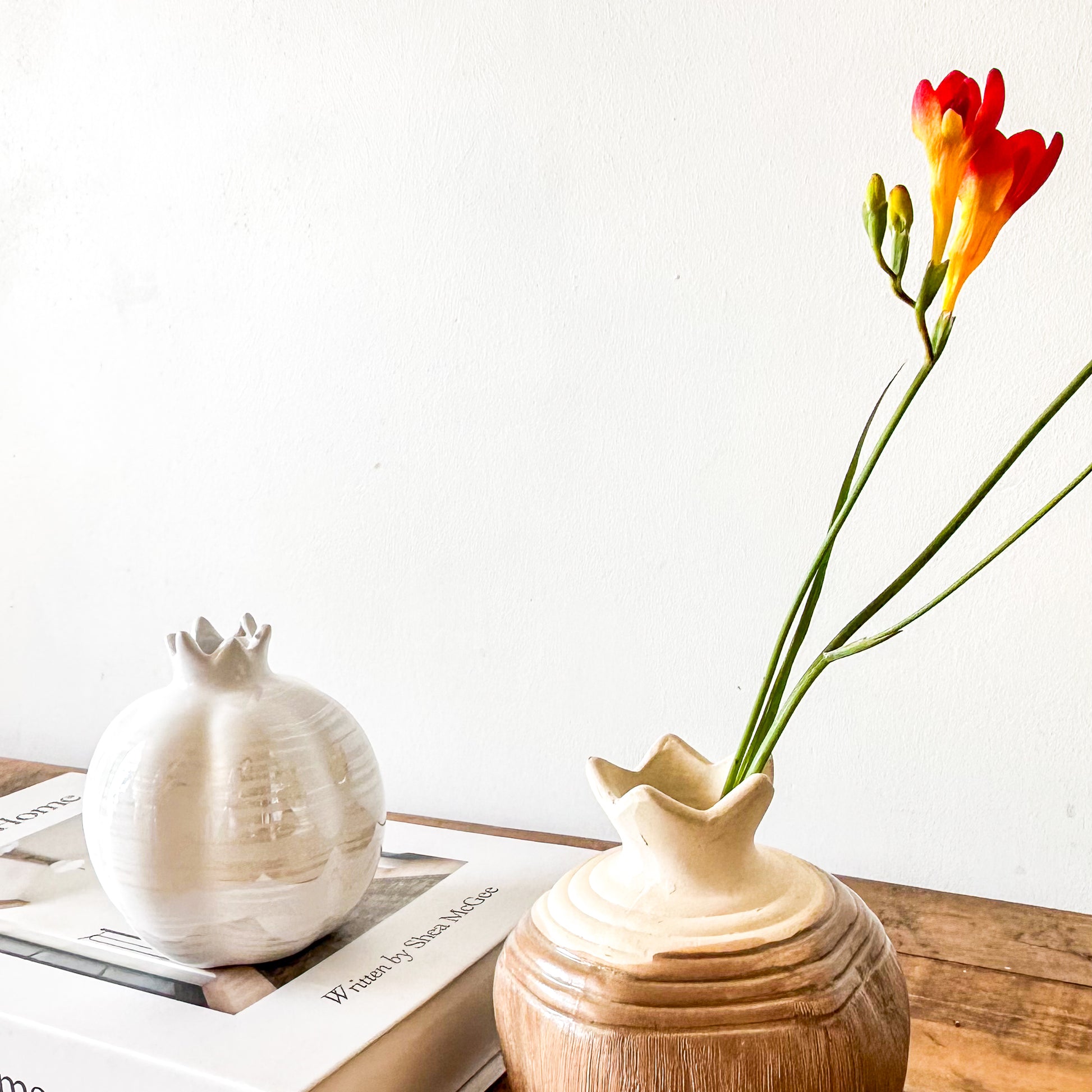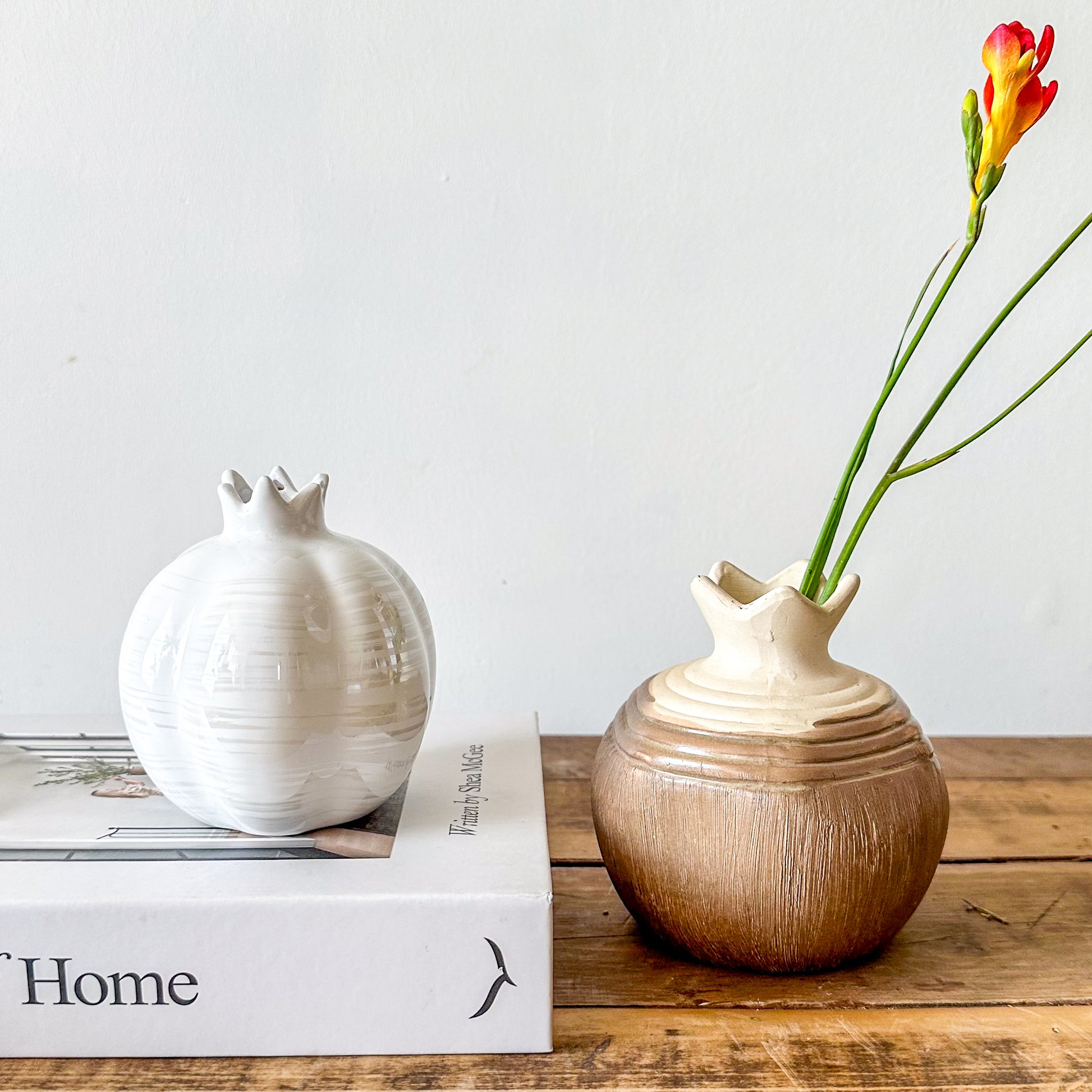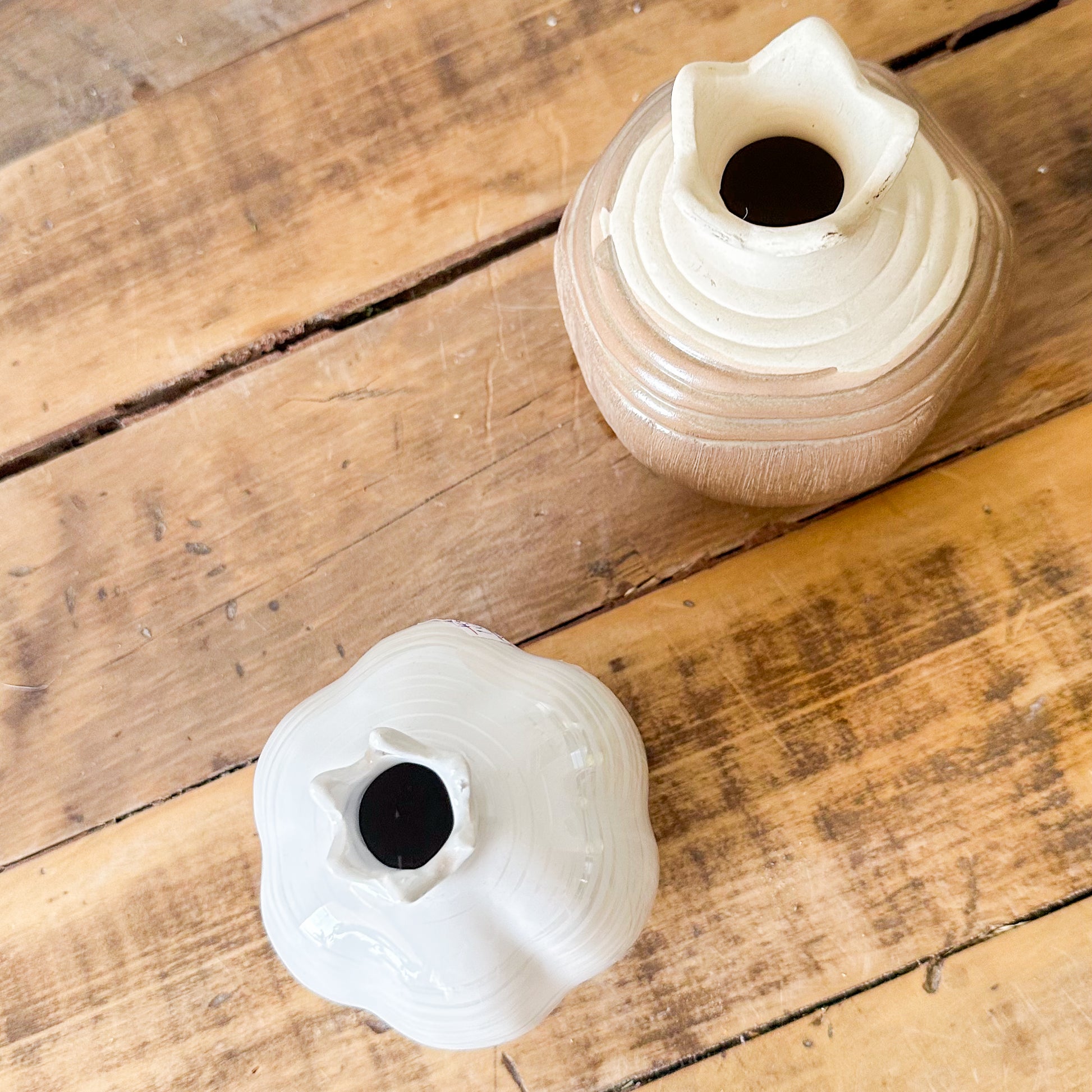 Este set de dos floreros combina elegancia y sofisticación con su paleta de colores neutros: beige, café y blanco. Cada pieza está adornada con delicadas líneas doradas que aportan un toque exclusivo y moderno, ideal para realzar cualquier ambiente con estilo y sutileza. Perfectos para exhibir flores frescas o secas, estos floreros son un complemento distinguido para su decoración.