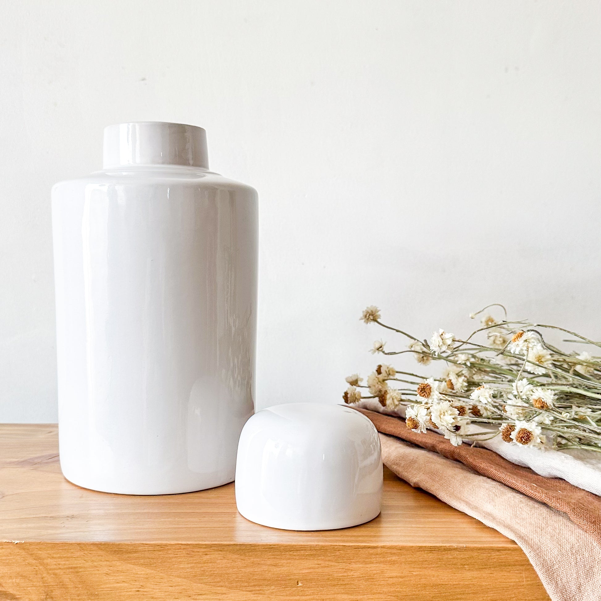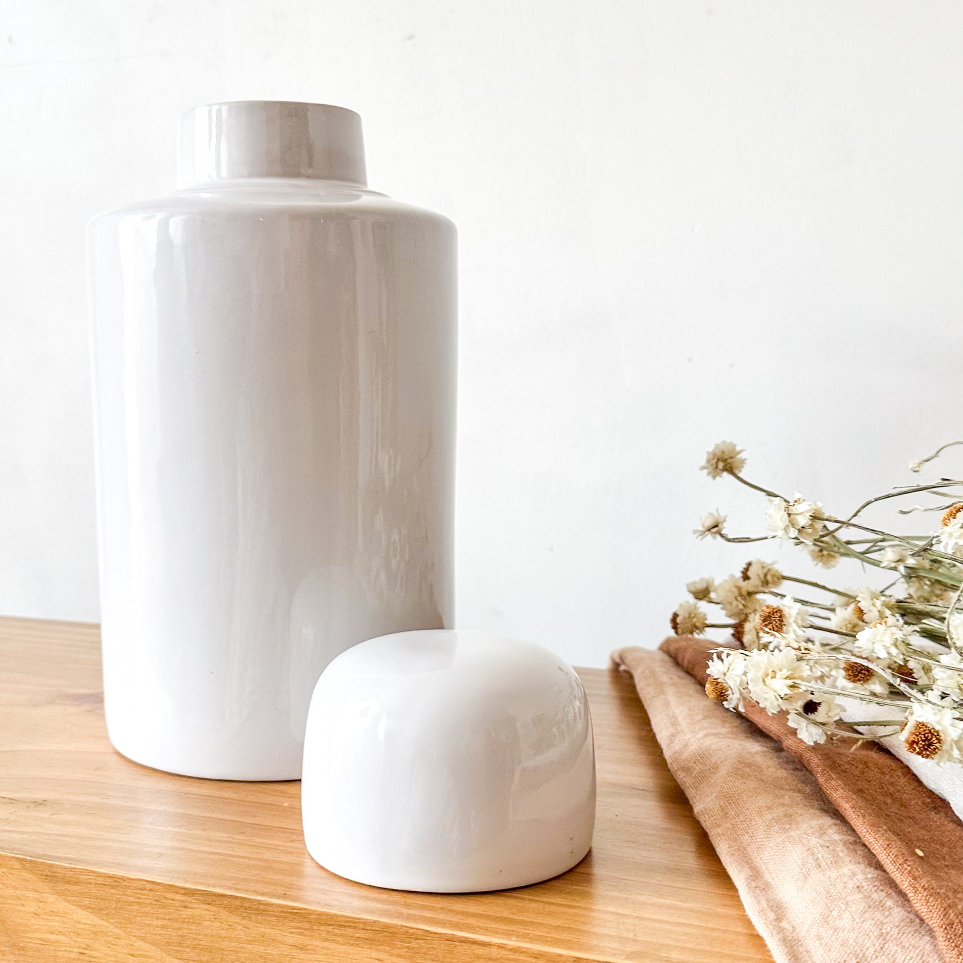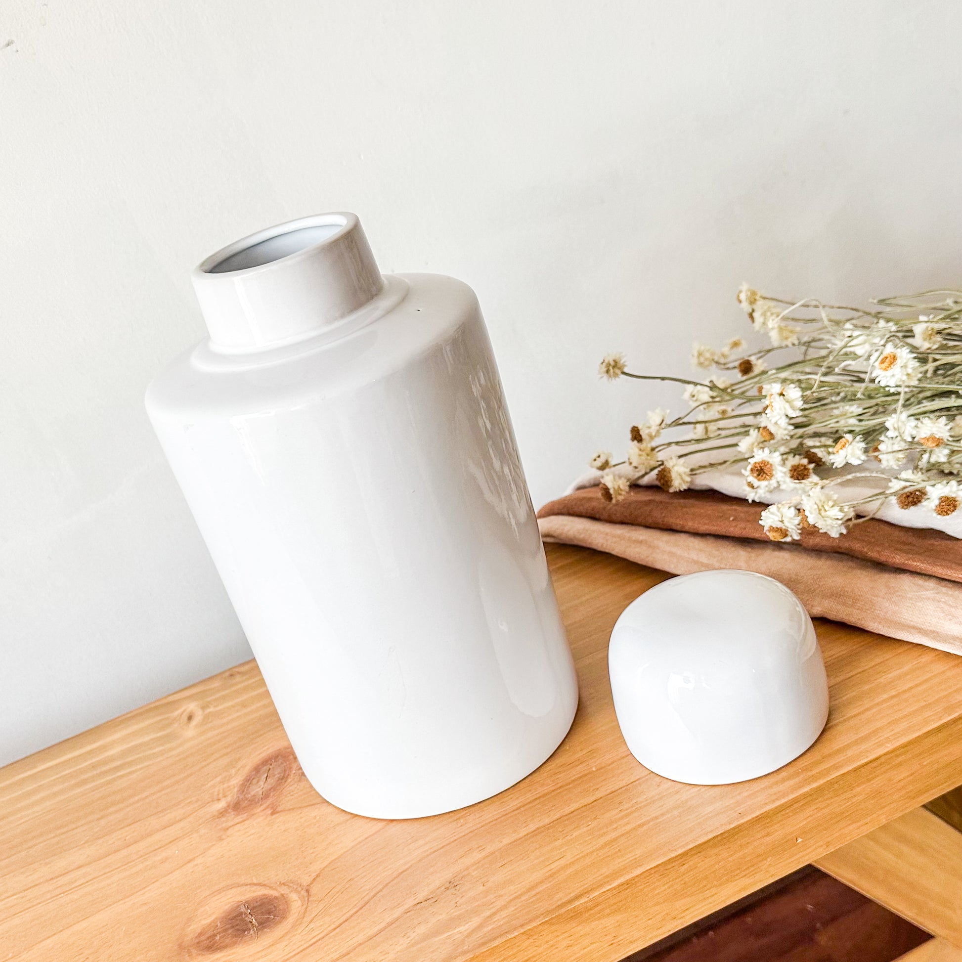 Esta vasija de cerámica con tapa, con dimensiones de 28 cm de alto, 14 cm de base y 7 cm de boca, combina elegancia y funcionalidad. Su diseño cuidadosamente elaborado permite conservar y presentar sus contenidos con sofisticación, siendo ideal para ambientes que buscan un toque de distinción. Perfecta para decorar y almacenar con estilo.